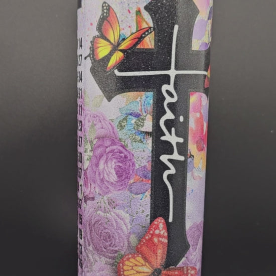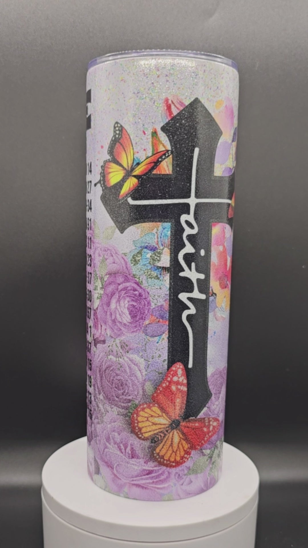 This 20-ounce stainless steel insulated tumbler combines functional design with meaningful spiritual expression. The double-wall construction provides superior temperature retention for both hot and cold beverages, while the glittery background creates an eye-catching foundation for the design elements. A prominent cross paired with "faith" messaging anchors the composition, complemented by a carefully curated selection of colorful flowers and butterflies that enhance visual appeal without overwhelming the design. Inscribed with a list of which verses in the Bible will support you in times of feeling sad, worried, lonely, afraid, etc., the tumbler serves as a practical tool for daily spiritual reflection. The durable stainless-steel construction ensures longevity, making this an investment piece for those seeking to integrate their faith into everyday routines with sophistication and purpose.