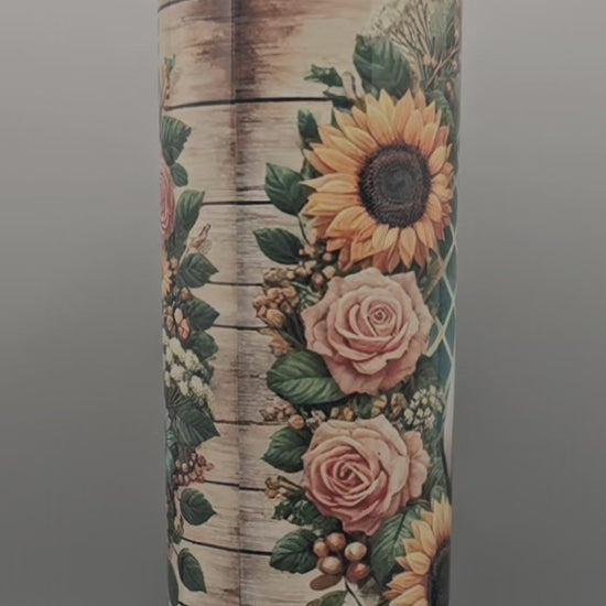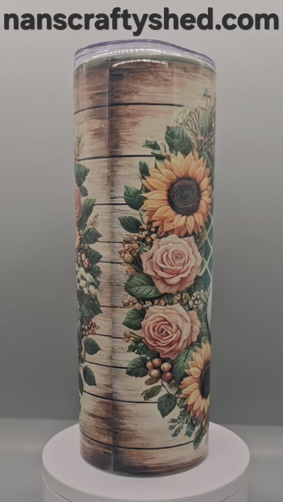 Enjoy your favorite beverages in style with our Horse Framed in Flowers 20-ounce Tumbler. Featuring a stunning design of a horse surrounded by sunflowers, roses, and daisies, this stainless steel insulated tumbler keeps your drinks hot or cold. It's perfect for on-the-go hydration while adding a touch of beauty to your day.