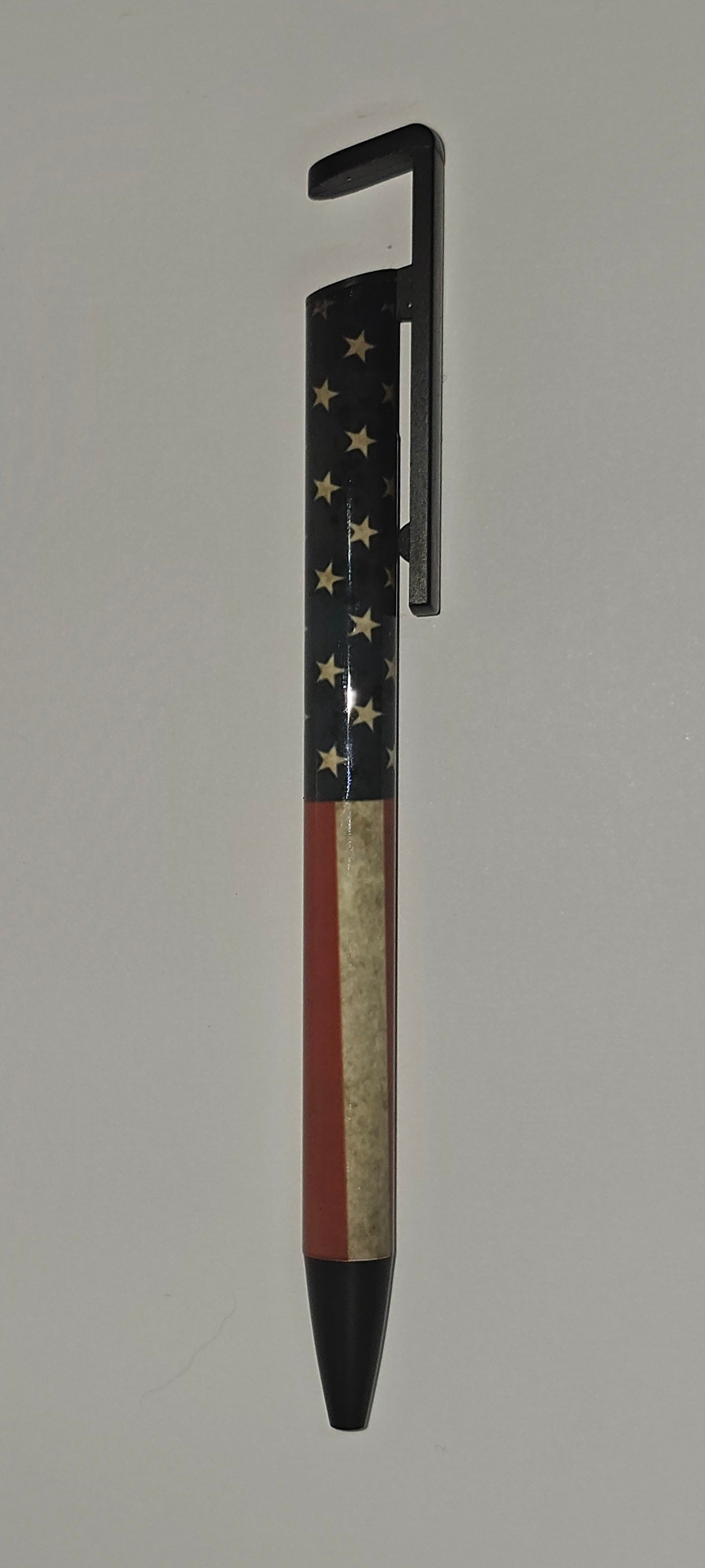 This multi-functional Patriotic pen serves as both a pen and a convenient phone stand. The bold red, white, and blue colors add a beautiful touch to your desk while also providing a practical solution for keeping your phone upright. Perfect for any patriotic individual looking for a versatile office accessory.