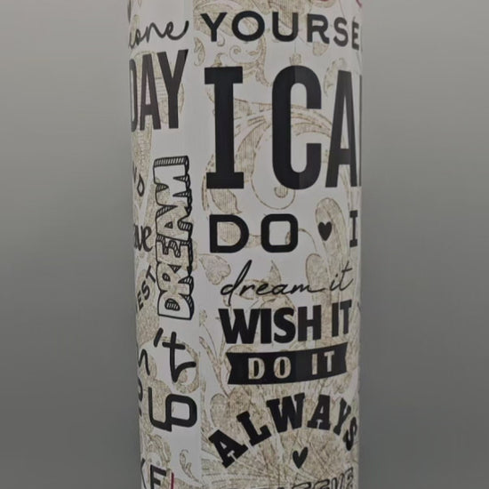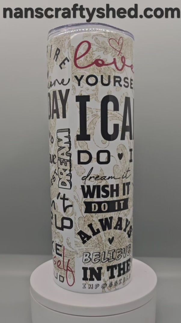 The Positive Vibes Tumbler is a 20-ounce stainless steel insulated container designed to keep beverages at optimal temperatures. Its collection of positive sayings serves as daily reminders of encouragement, promoting mental well-being. The insulated design maintains drink temperature for extended periods, enhancing user experience and hydration.