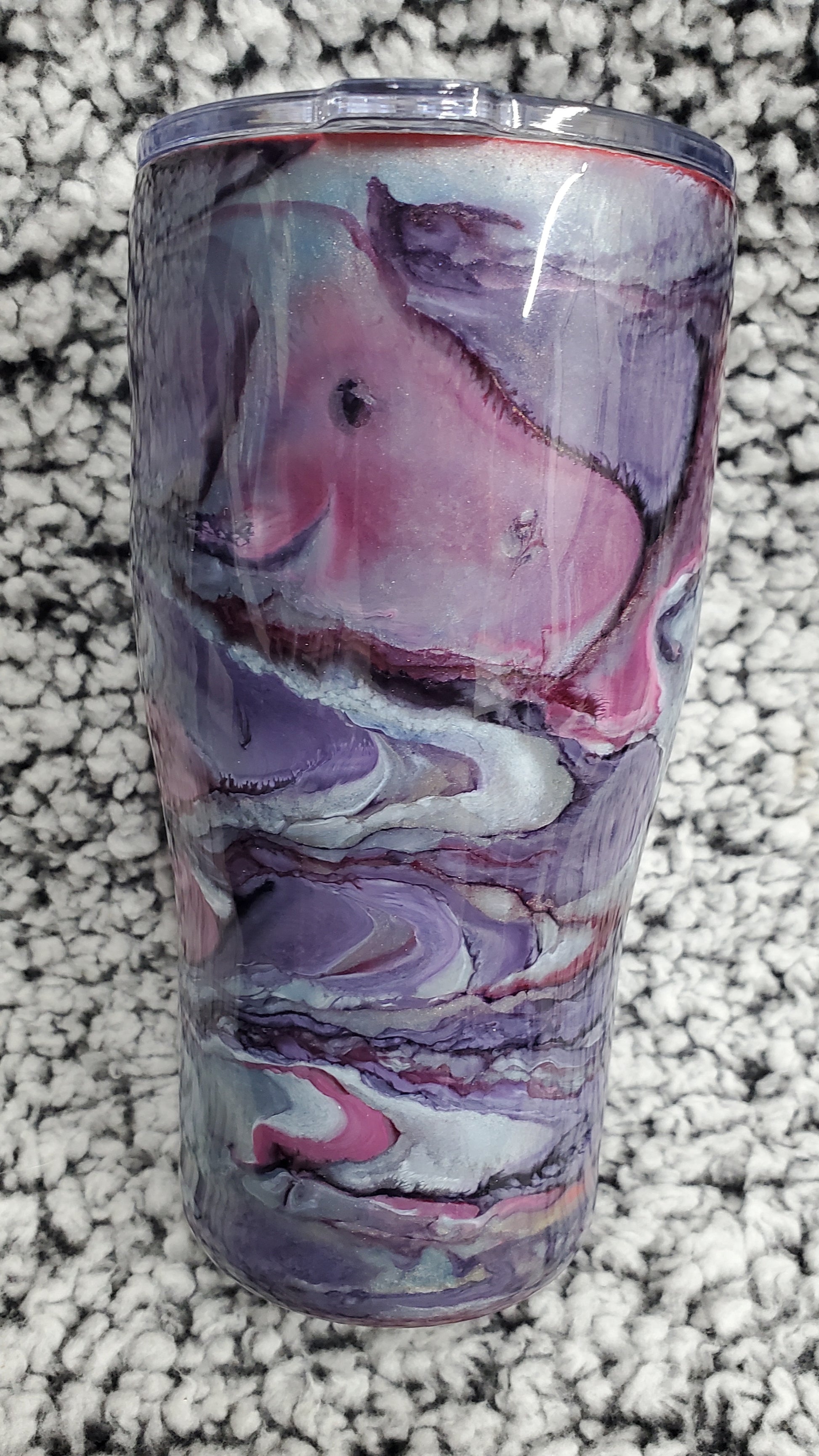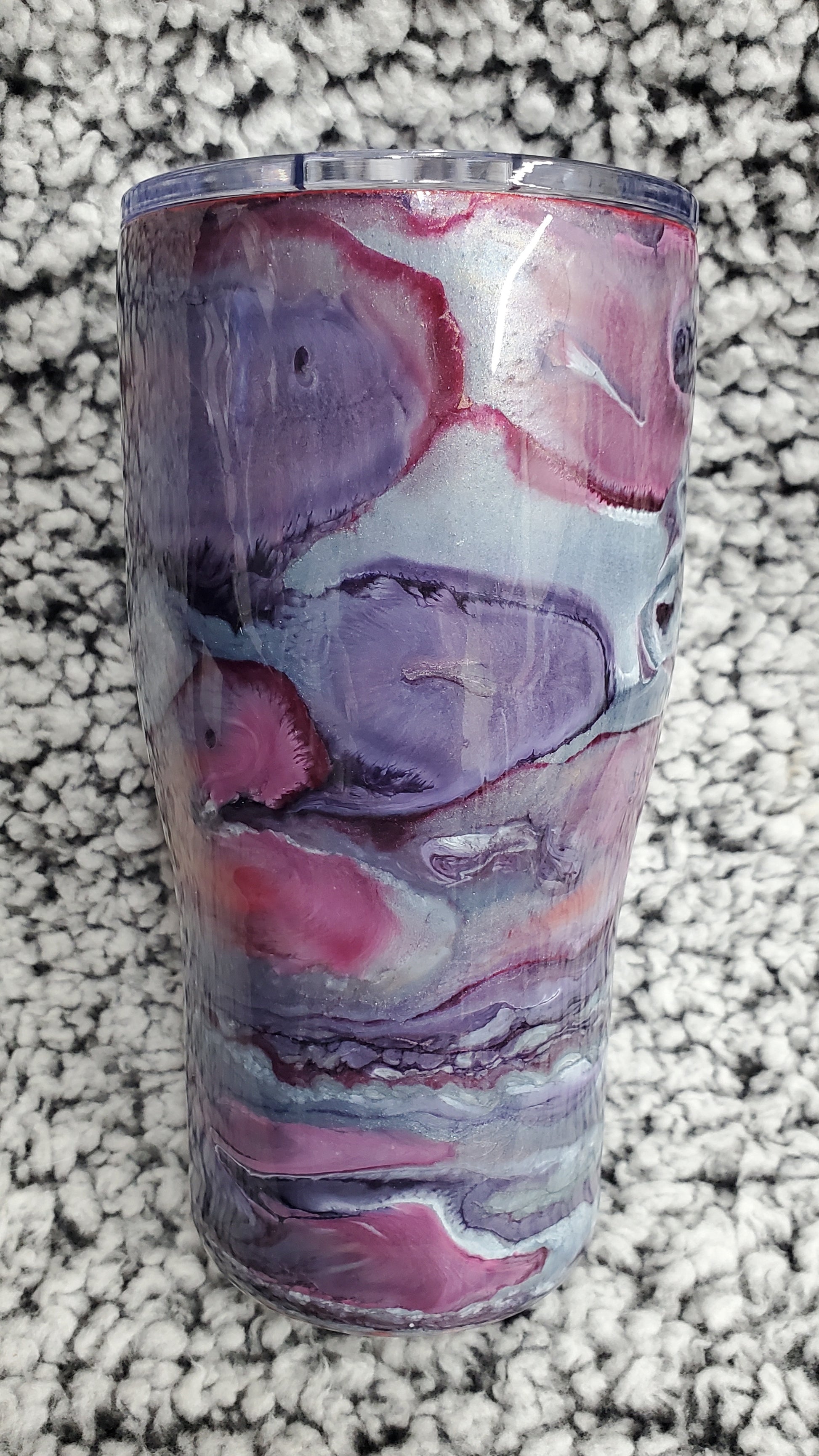 This beautiful tumbler has a swirl pattern with shades of purple, pink, silver and blue. It is a double wall insulated stainless steel travel mug.