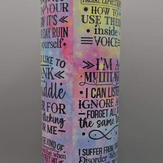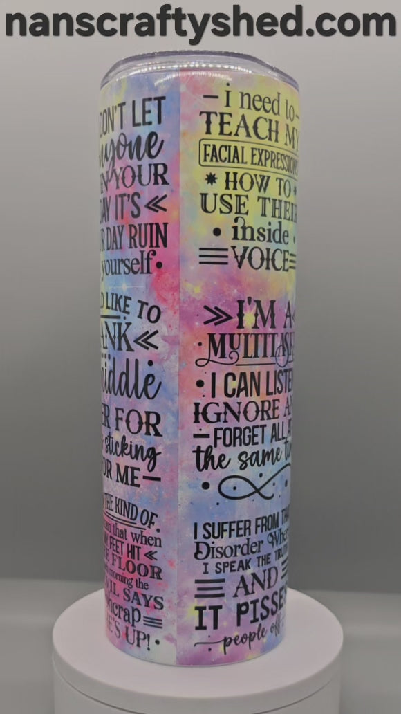 Embrace the chaos with the Sarcchotic 20-ounce Tumbler! This vibrant stainless steel companion packs a punch with its cheeky advice and definition of "Sarchotic." Fuel your day with a bright splash of pink, blue, or yellow. Fill it up, take a sip, and tackle life head-on!