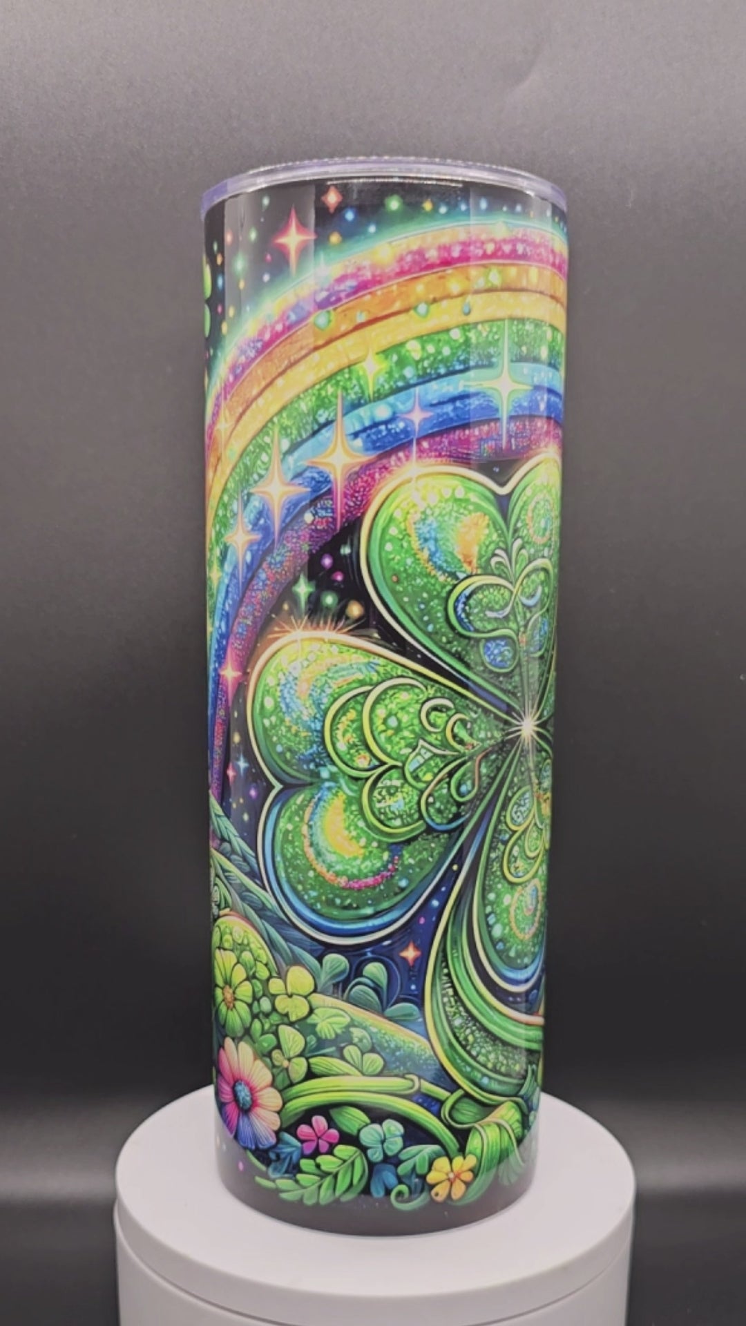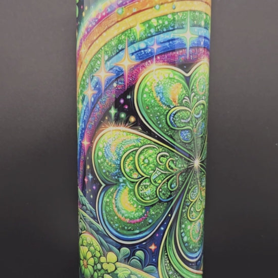 Unleash your St. Patrick's Day spirit with this powerhouse 20-ounce stainless steel tumbler. Featuring a daring sublimated design that explodes with lucky four-leaf clovers, lush flowers, and a vivid rainbow against a bold dark canvas, this tumbler commands attention. The rugged double-wall insulated construction stands up to any challenge while keeping your drinks perfectly chilled or piping hot. Fearless, vibrant, and built to make an impact—grab yours and show the world you're ready to seize the luck of the season.