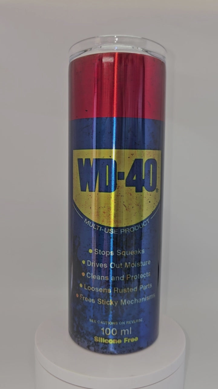 Sip in style with the WD-40 Metallic Background Tumbler! This 20-ounce insulated tumbler features a stainless steel background and a playful, eye-catching WD-40 design. Keep your drinks at the perfect temperature while adding a touch of quirkiness to your daily routine.